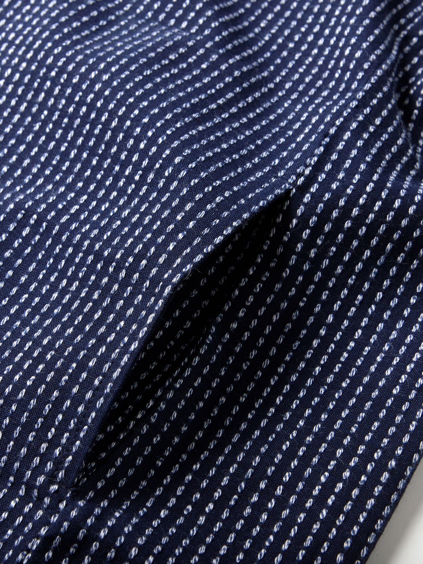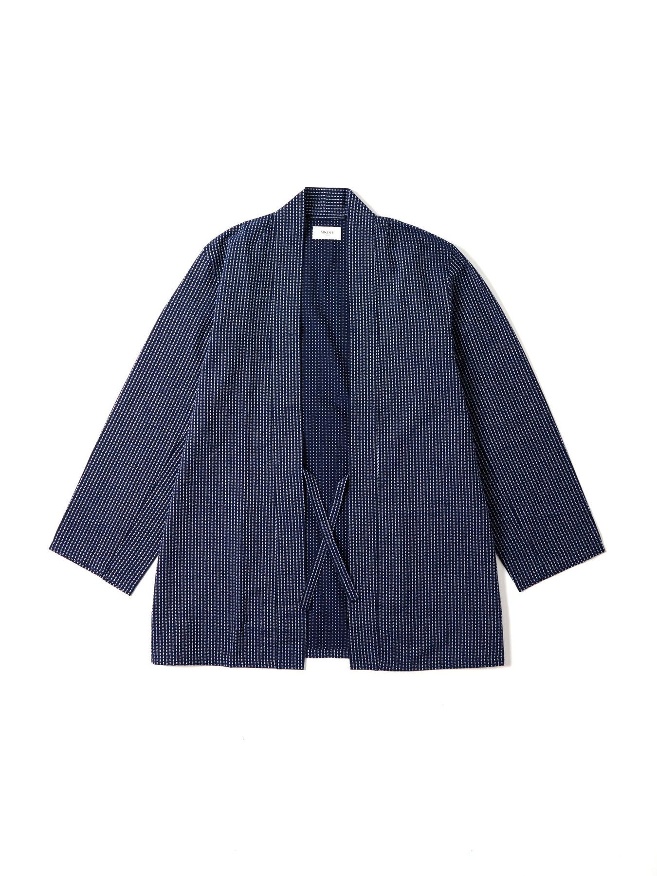 The haori jacket features intricate Sashiko Japanese embroidery in the kakinohanazashi (rice-grain) style, creating a uniquely tactile, textured look. The design includes four practical pockets, two discreetly placed inside and two outside, while the distinctive haorihimo ties at the front allow you to wear the jacket open or lightly fastened.