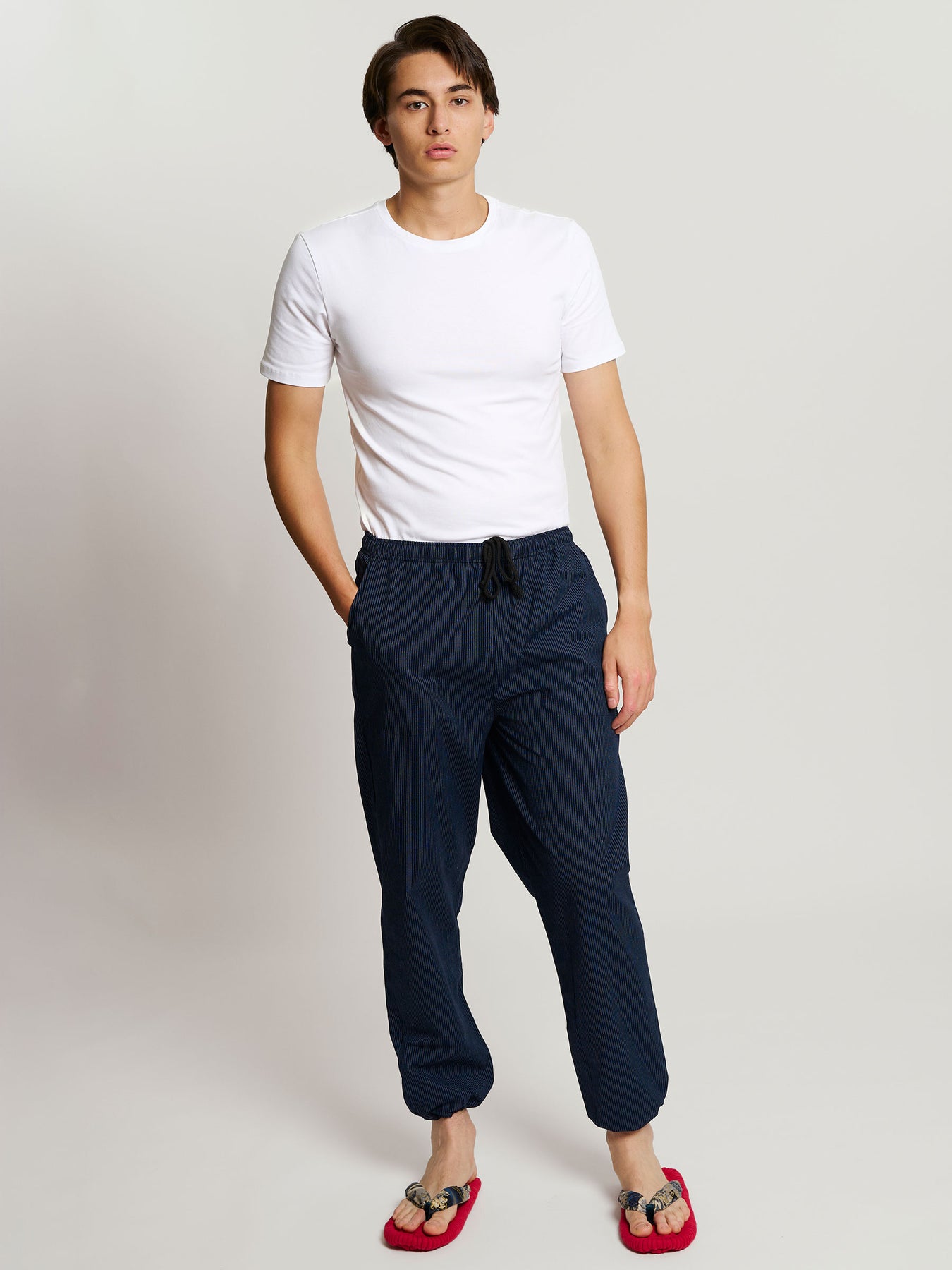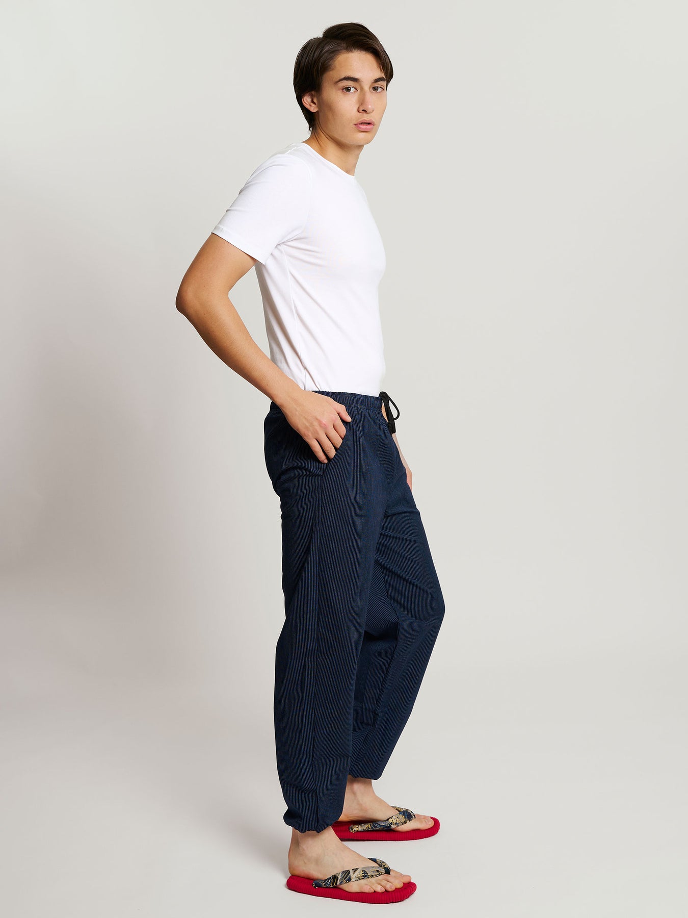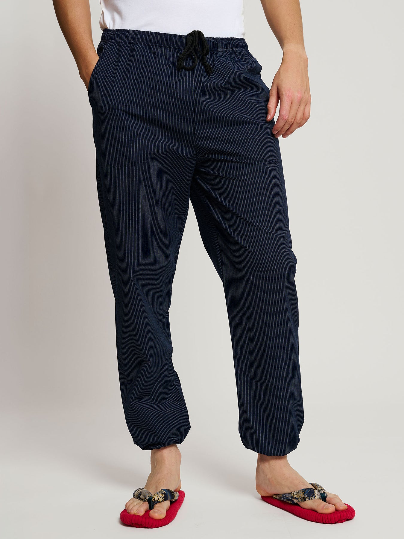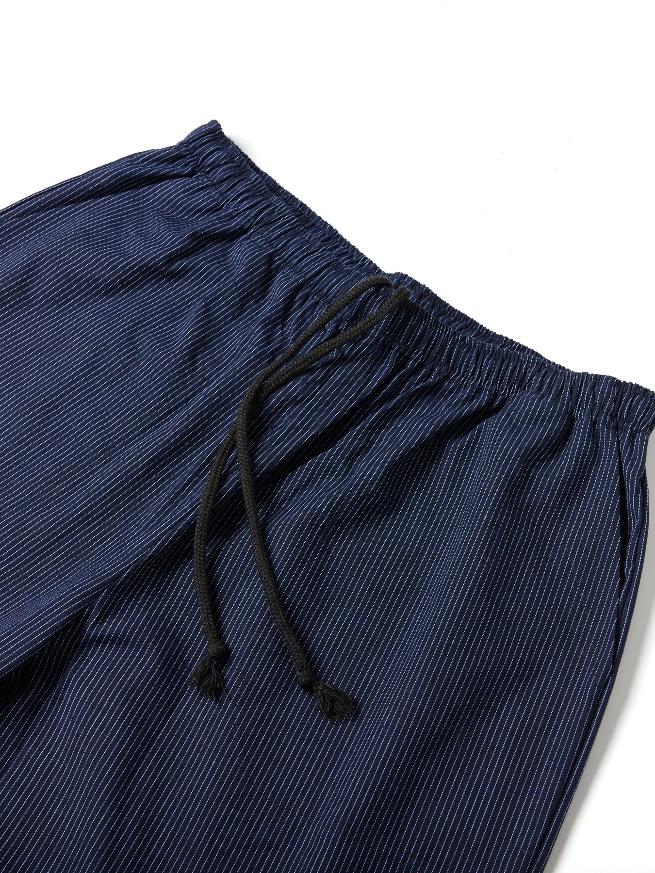 Monpe men’s cotton lounge pants are crafted in Kurume, Kyushu, a historic center of Japanese cotton weaving, bringing the ingenuity of traditional Japanese workwear into contemporary everyday style.